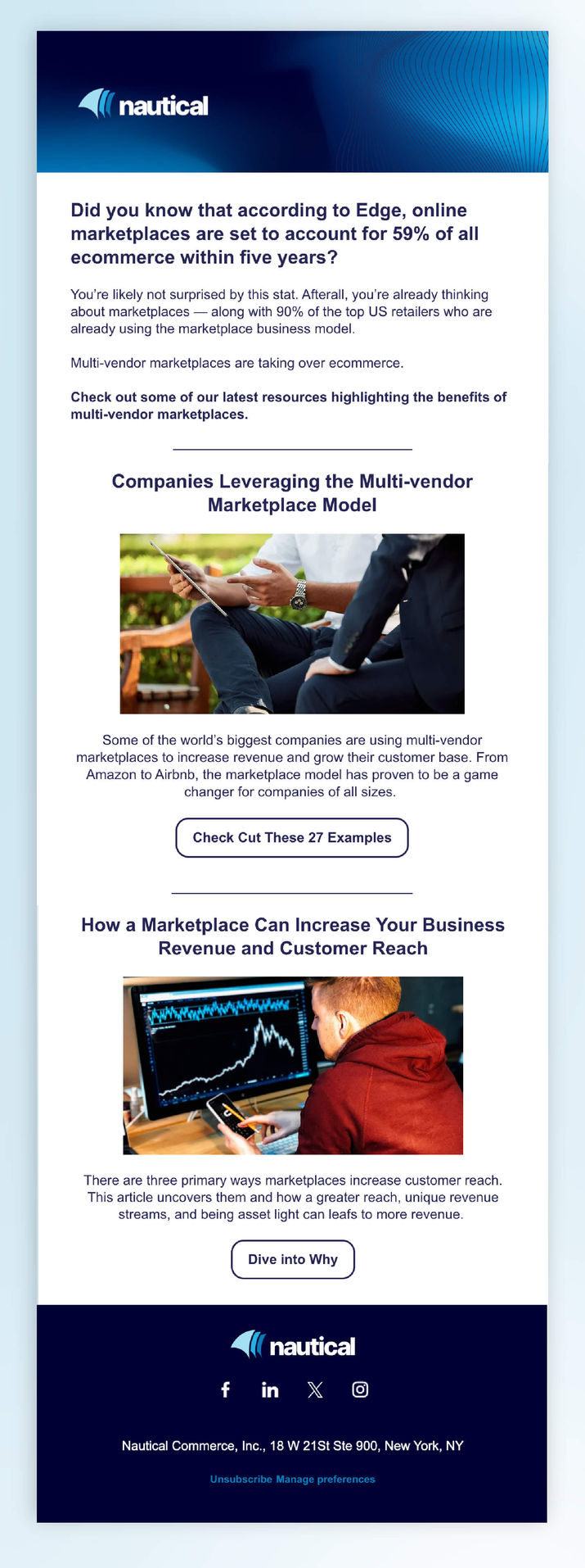 Nautical Commerce is a multi-vendor dropship and marketplace platform for retailers, brands, and B2B businesses. As an early stage SaaS startup, Nautical's product and go-to-market strategy is ever-changing. My challenge was to create and implement a cohesive and adaptable visual brand to position Nautical among it's more established competitors and appeal to shifting audiences. Anchored to the "Magician" archetype, the brand was built to insire business transformation through multi-vendor commerce. Part of the branding magic was creating a visual brand that gave this young startup the illusion of "looking bigger than we are".